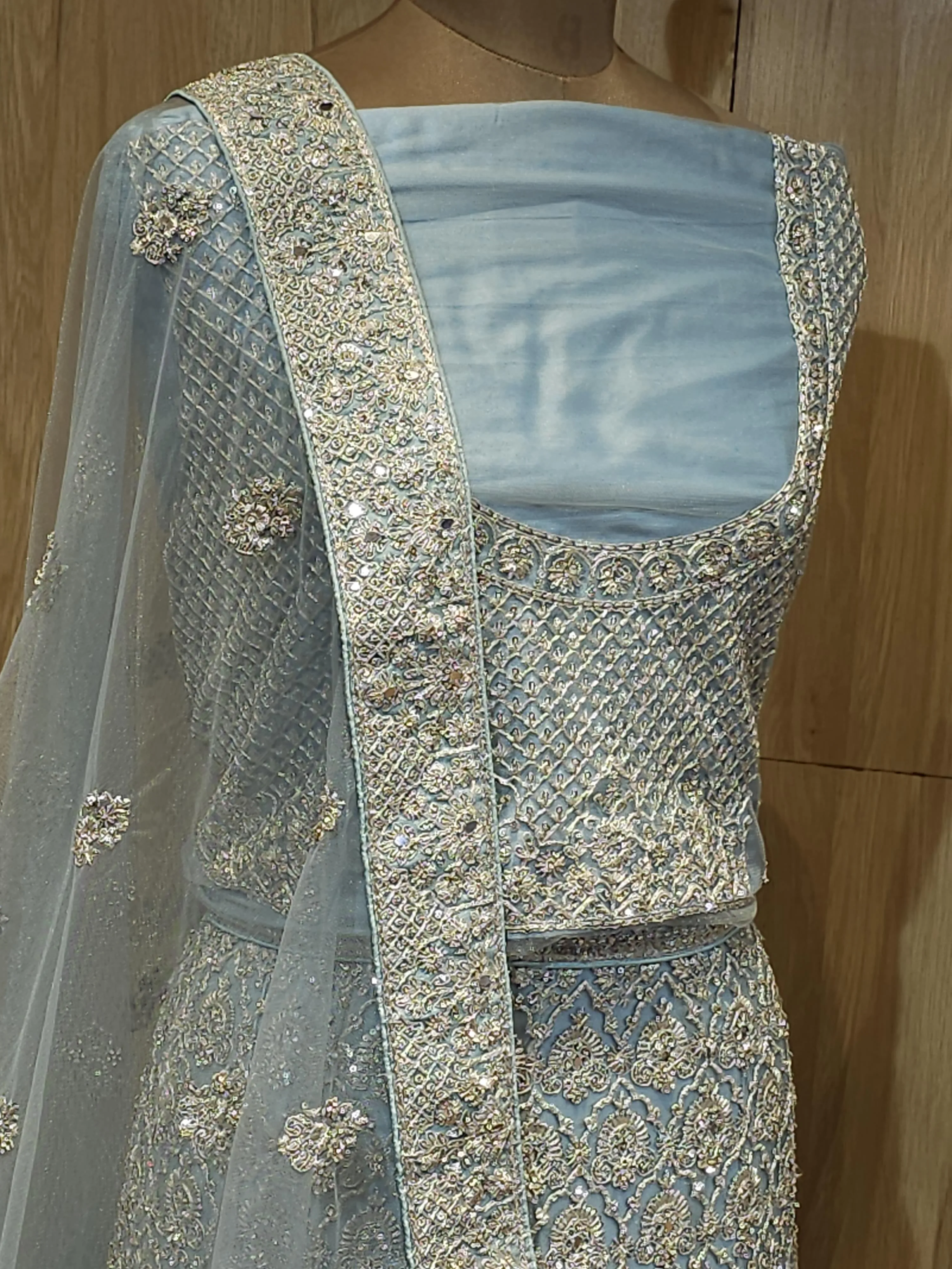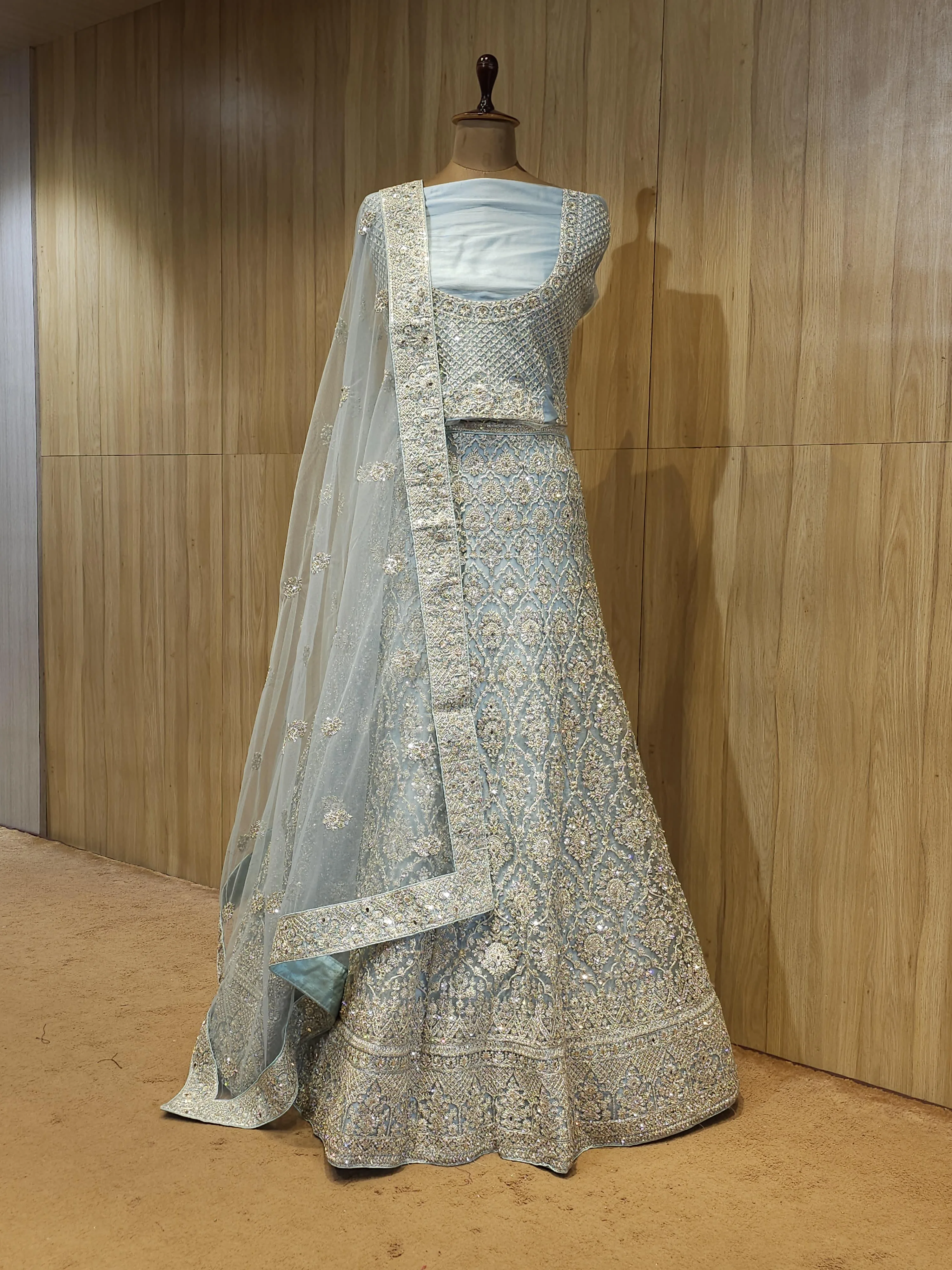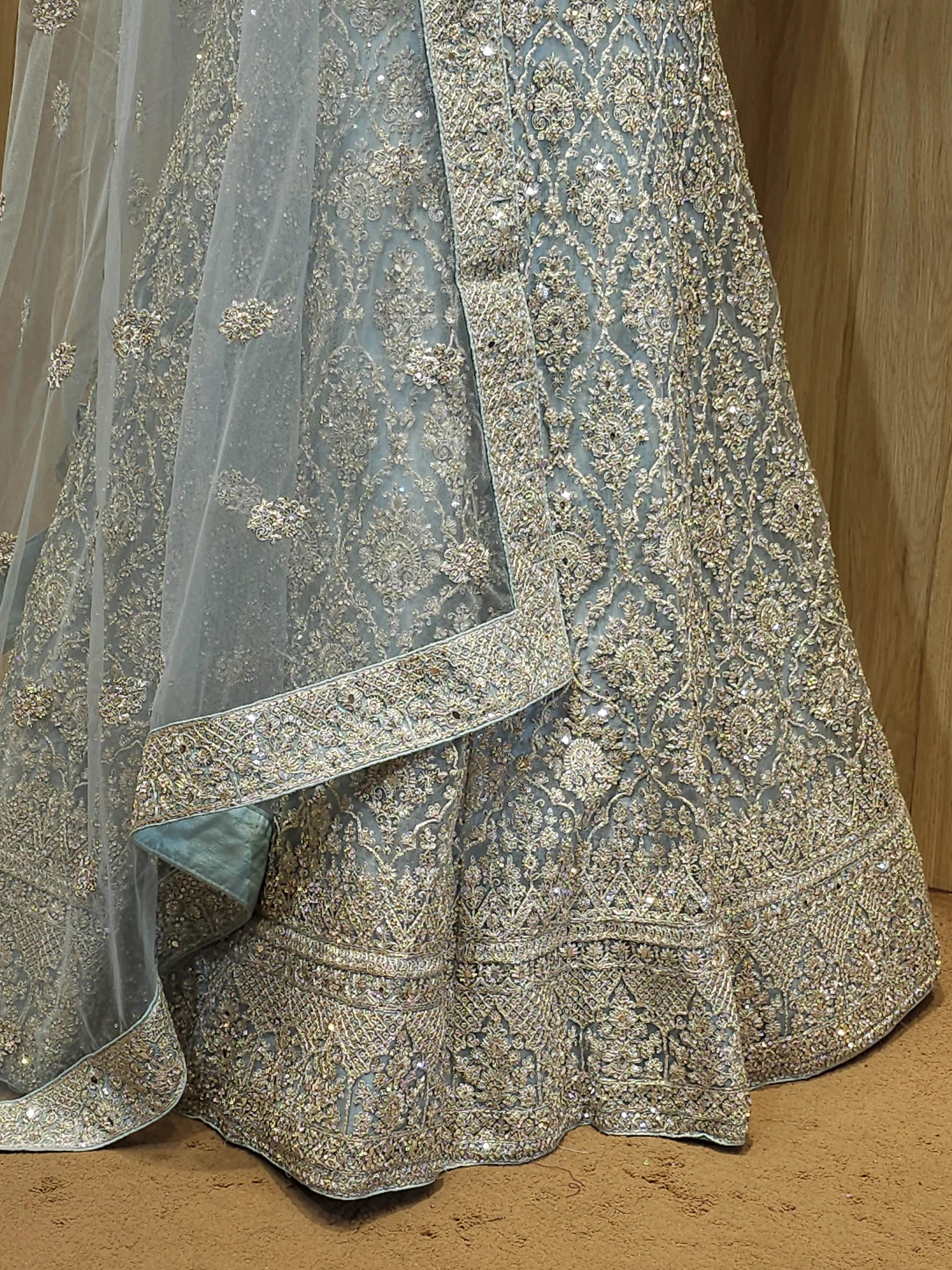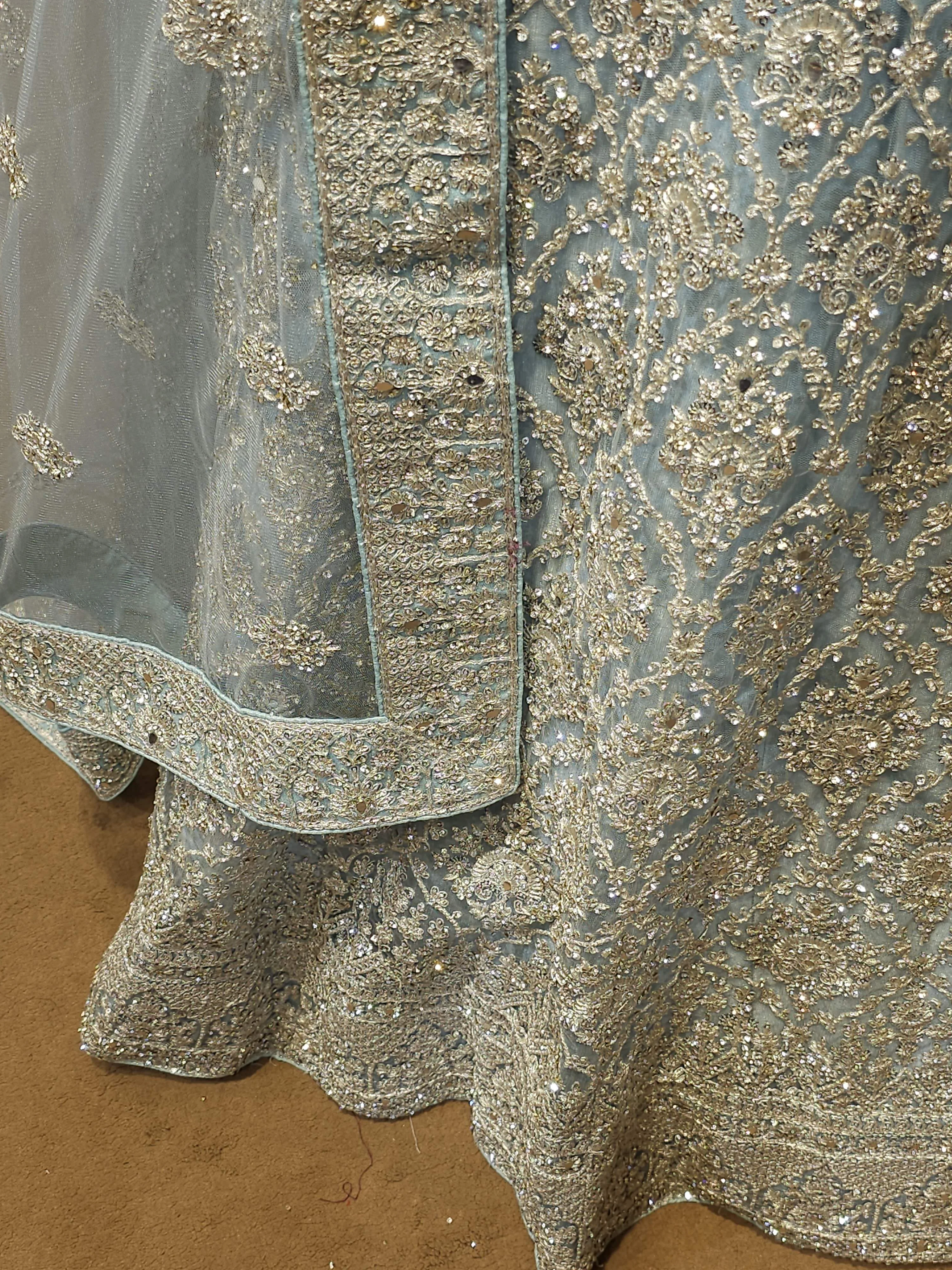 Exude sophistication and grace with this Light Blue Silver Zari Embroidered Bridal Lehenga.