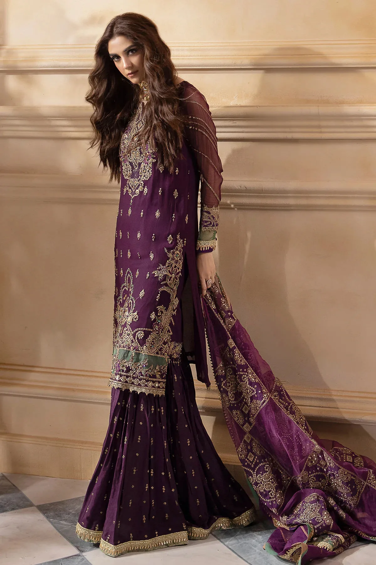 - Front (1MTR): Embroidered + Adda Work on dyed chiffon