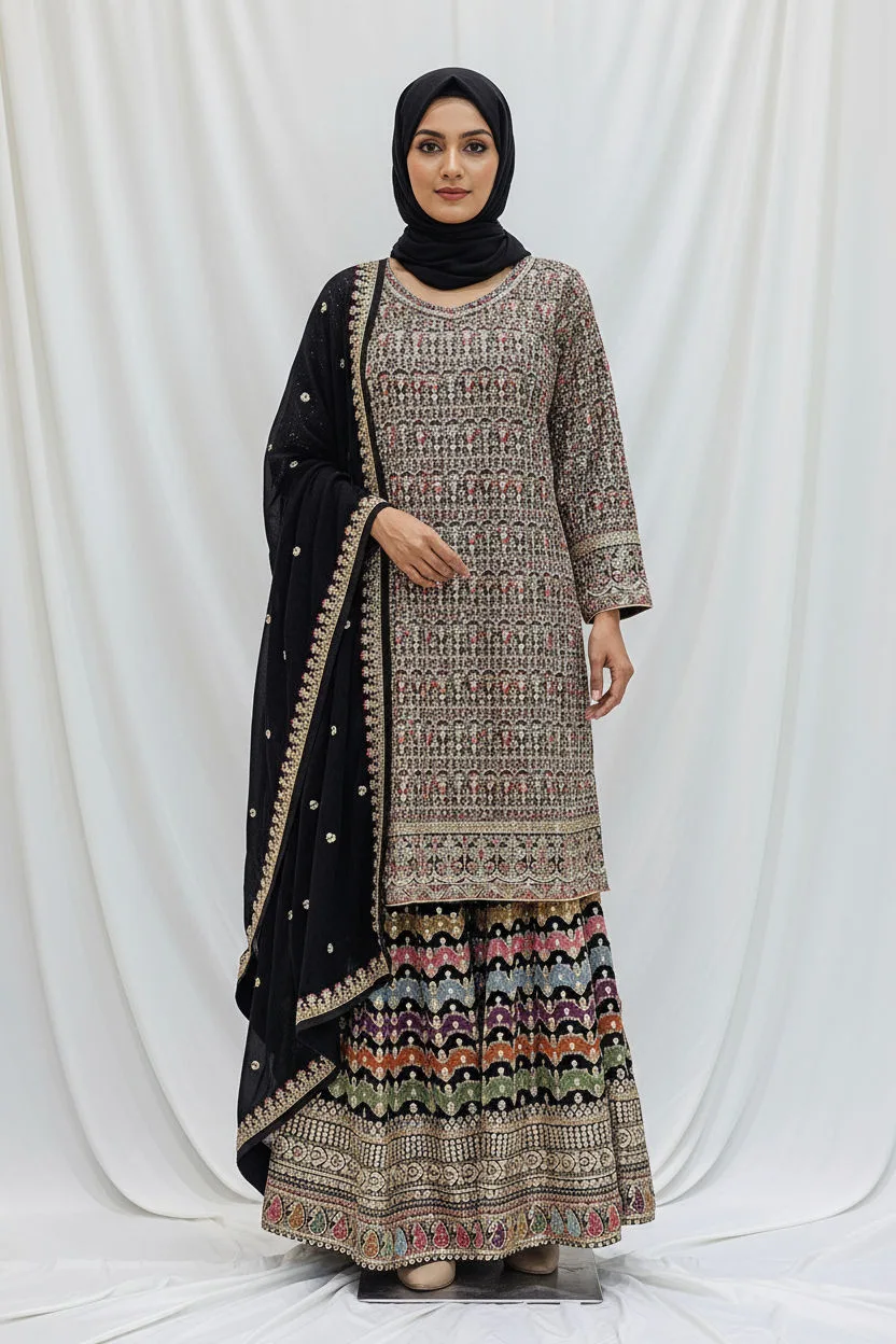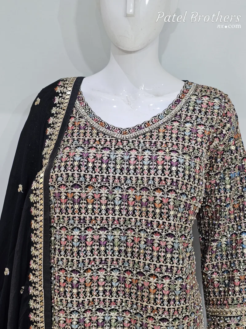Turn heads this season with this stunning black Pakistani outfit crafted in pure Chinon chiffon ✨. The top features beautiful Kashmiri-style multicolored embroidery 🌸 that adds a pop of color and traditional charm. Paired with a gorgeously flared kali-style embroidered palazzo 🎨 and a four-side bordered chiffon dupatta 🪷, this ensemble is elegance redefined.