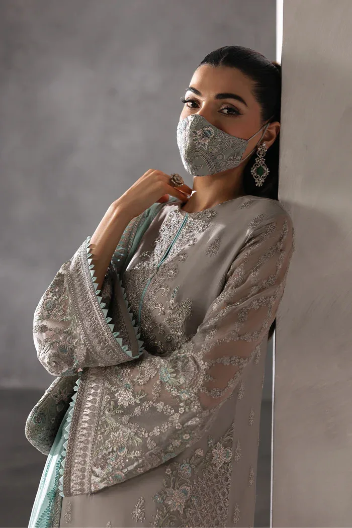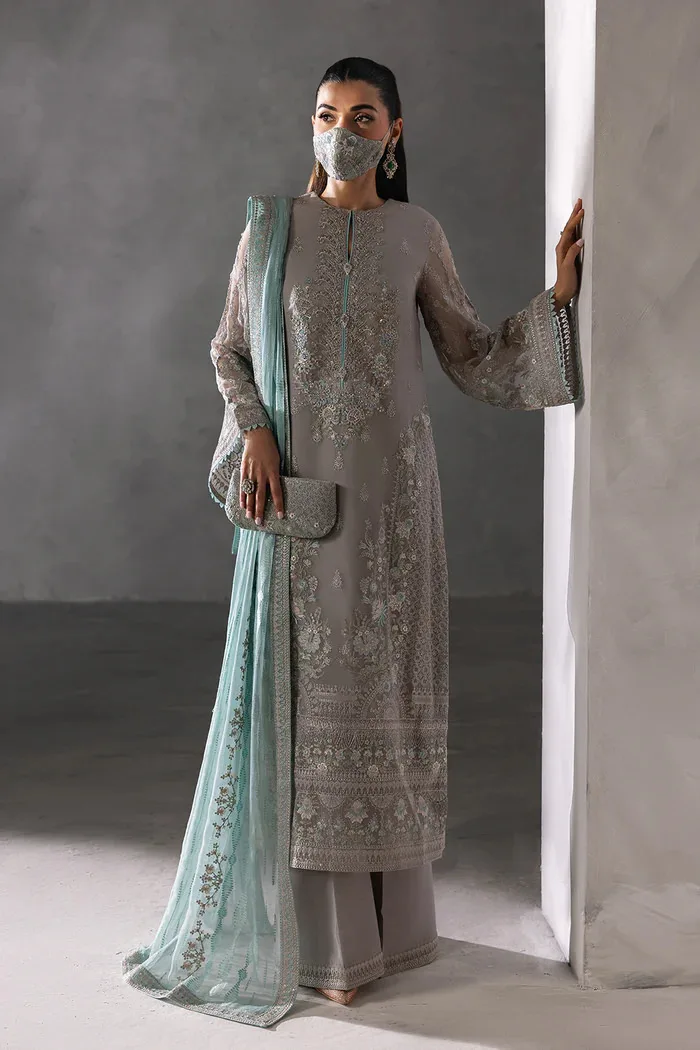 Light Gray Chiffon Suit with Aqua Blue Contrast Dupatta & Hand Embellished Neckline | LA-908