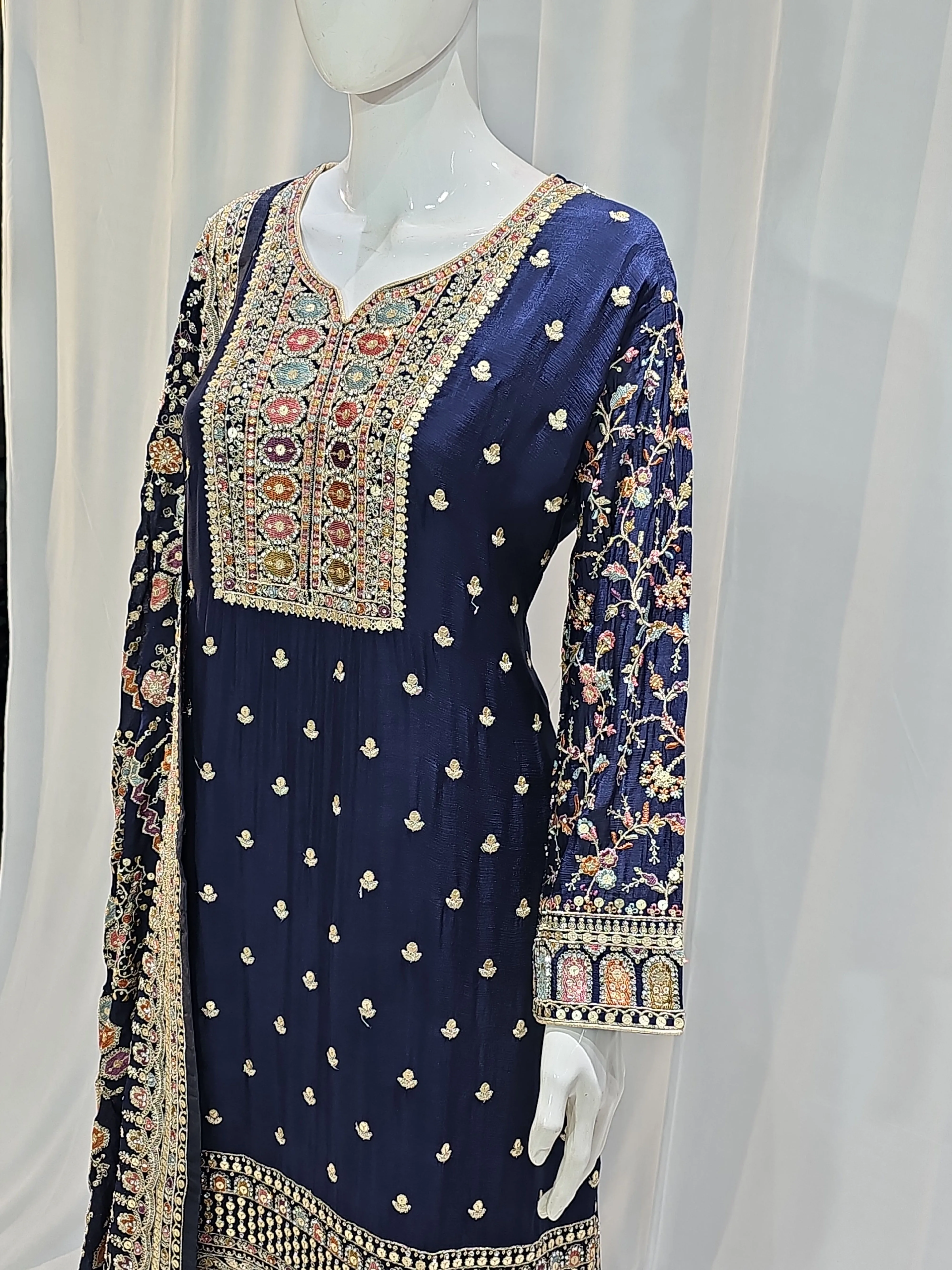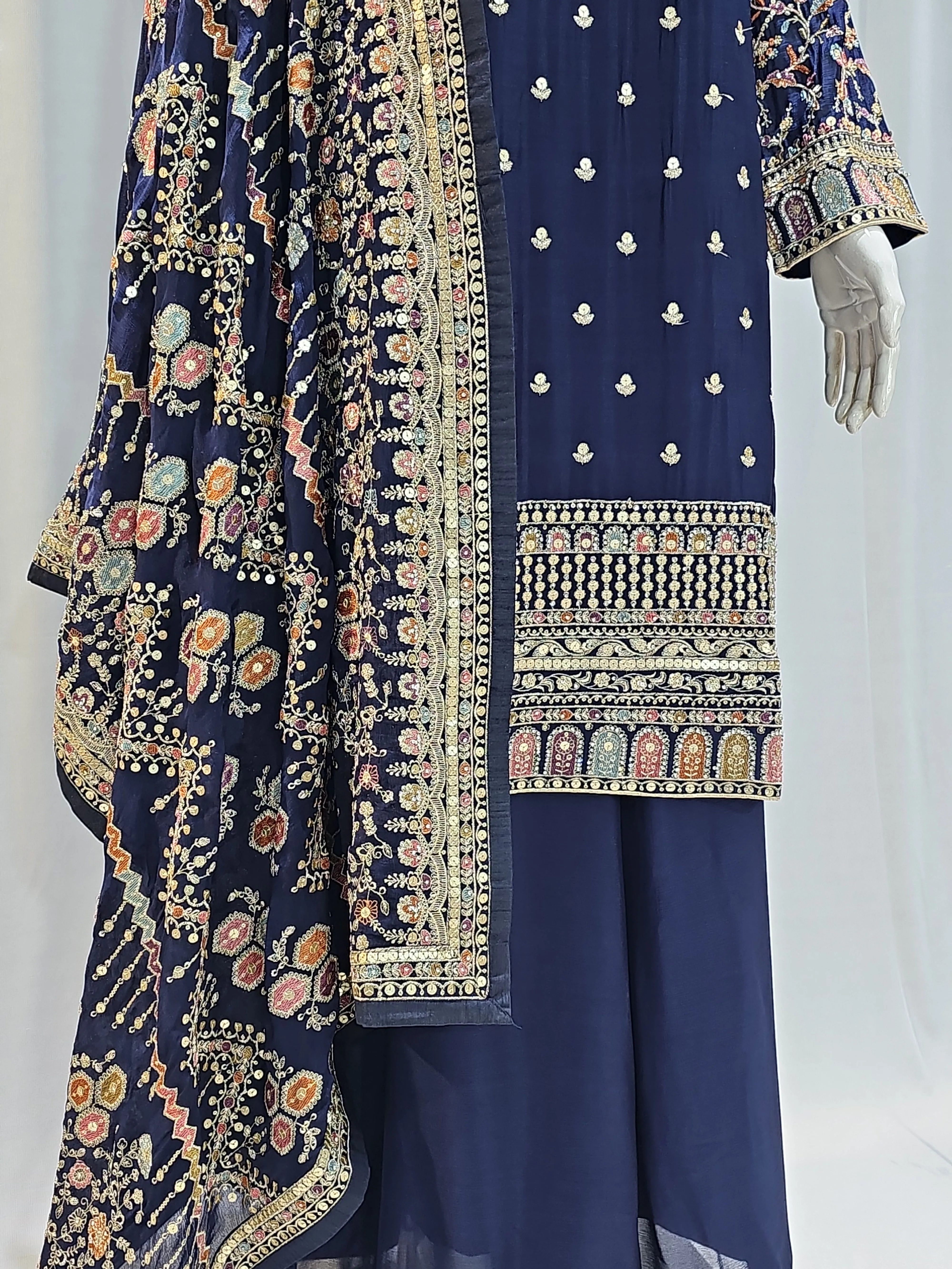 Navy Blue Elegant Embroidered Georgette Straight Pakistani Palazzo Suit 3514