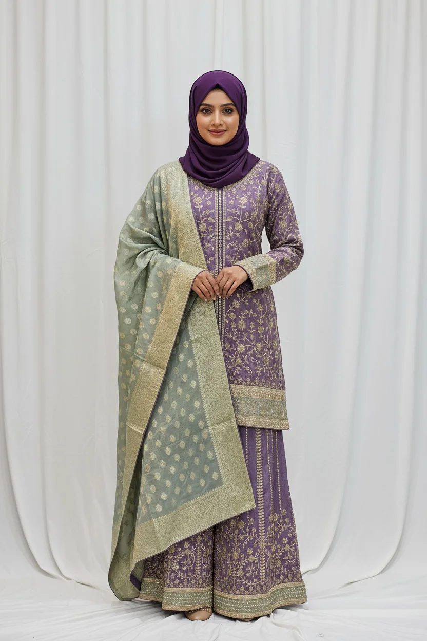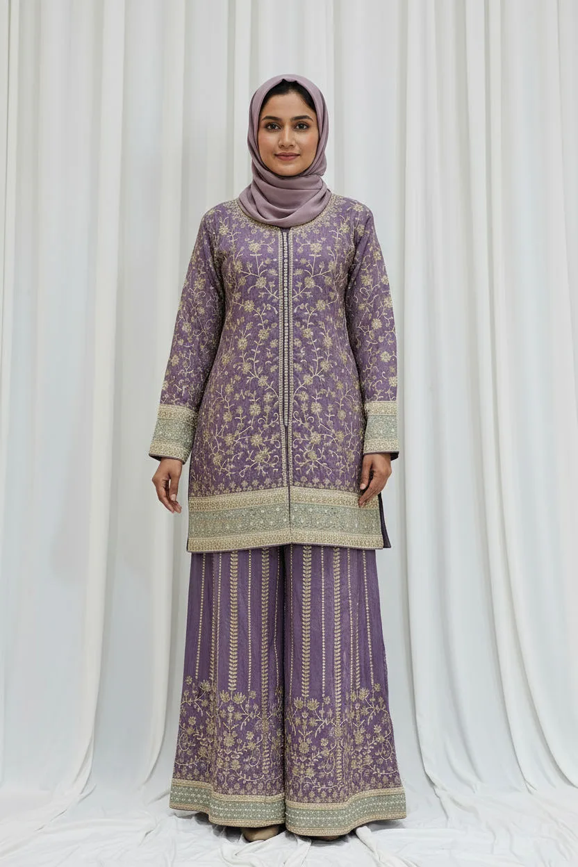 Pure Shimmer Tissue Lilac Purple Suit – Traditional Elegance with Handcrafted Details | 3586 B